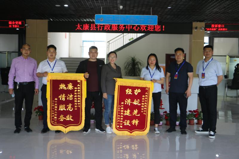 優(yōu)質(zhì)服務(wù)促發(fā)展,企業(yè)感動(dòng)送錦旗。5月8日下午,周口展圖置業(yè)有限公司負(fù)責(zé)人帶著印有“護(hù)航先鋒、經(jīng)濟(jì)建設(shè)”和“廉潔高效、熱情服務(wù)”的錦旗,來(lái)到太康縣行政服務(wù)中心工程建設(shè)項(xiàng)目綜合受理窗口,對(duì)窗口工作人員專(zhuān)業(yè)貼心、熱情周到、規(guī)范高效的服務(wù)表達(dá)真摯感謝。