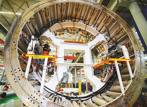 鄭州市經(jīng)開區(qū)中鐵工程裝備集團有限公司生產(chǎn)車間,工人在加緊生產(chǎn)。2009年在鄭州成立的中鐵裝備,目前已是中國最大的隧道掘進機制造服務(wù)商。 聶冬晗攝(中經(jīng)視覺)