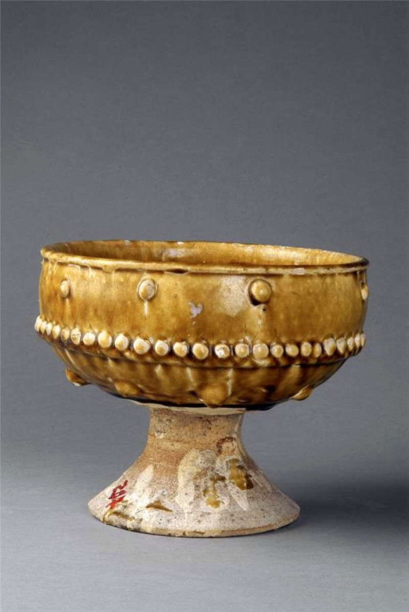壽州窯主要生產(chǎn)與生活相關(guān)的碗、盞、杯、缽、注子等,其生產(chǎn)的高檔產(chǎn)品深受當(dāng)時(shí)富貴之家追捧。唐代是中國(guó)歷史上的盛世,社會(huì)經(jīng)濟(jì)繁榮,黃釉瓷與體現(xiàn)皇權(quán)的皇家貴族崇尚的富貴色彩不謀而合,所以黃釉瓷器很快受到社會(huì)的熱捧,黃釉瓷豆也流行開來,且造型富于變化,這件黃釉乳釘紋豆口、腹、底部都有不同的變化,給人以線條流暢、造型優(yōu)美的印象。