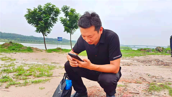張志新在賈魯河西華城區(qū)段采訪汛情后現場寫稿