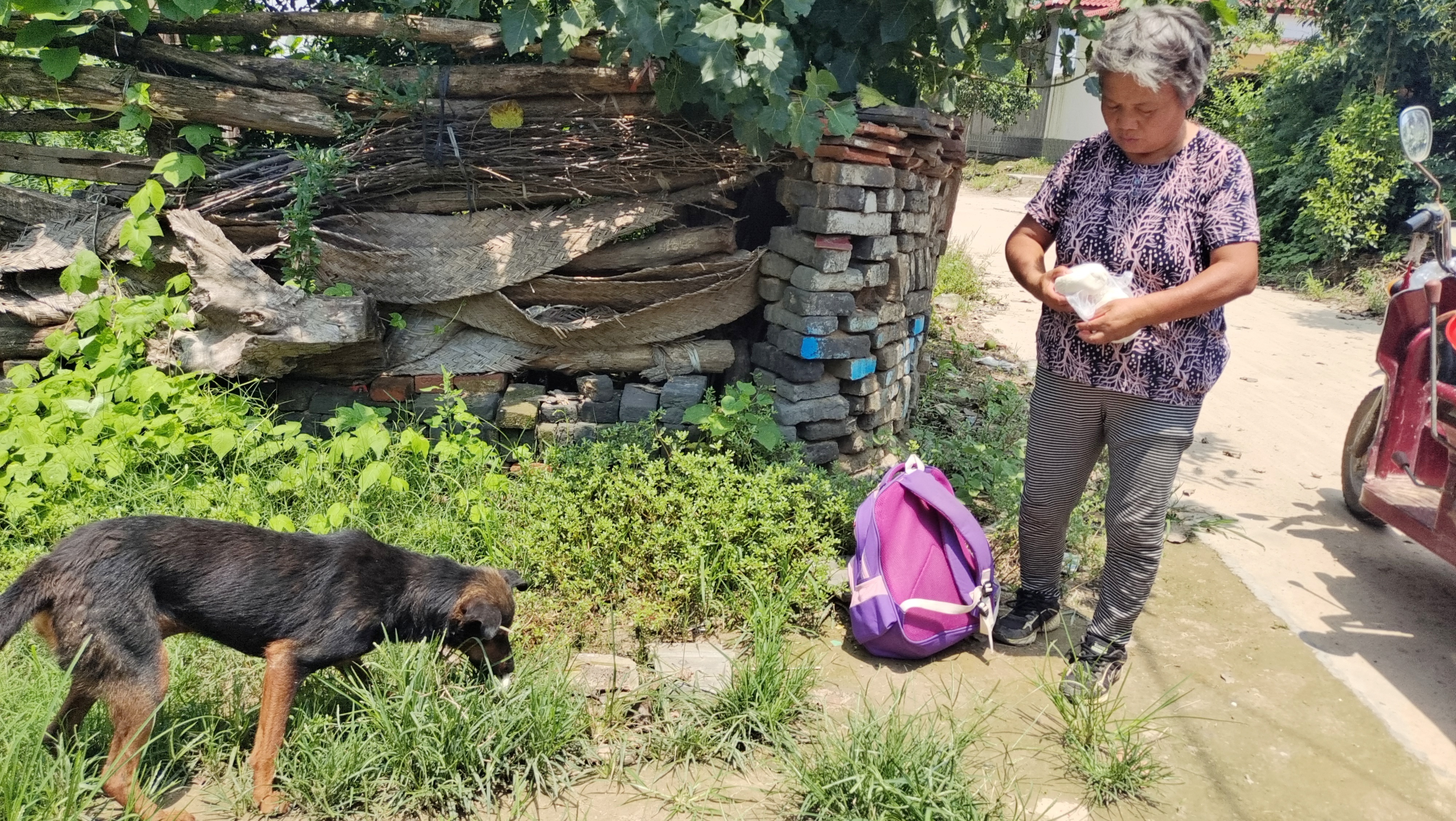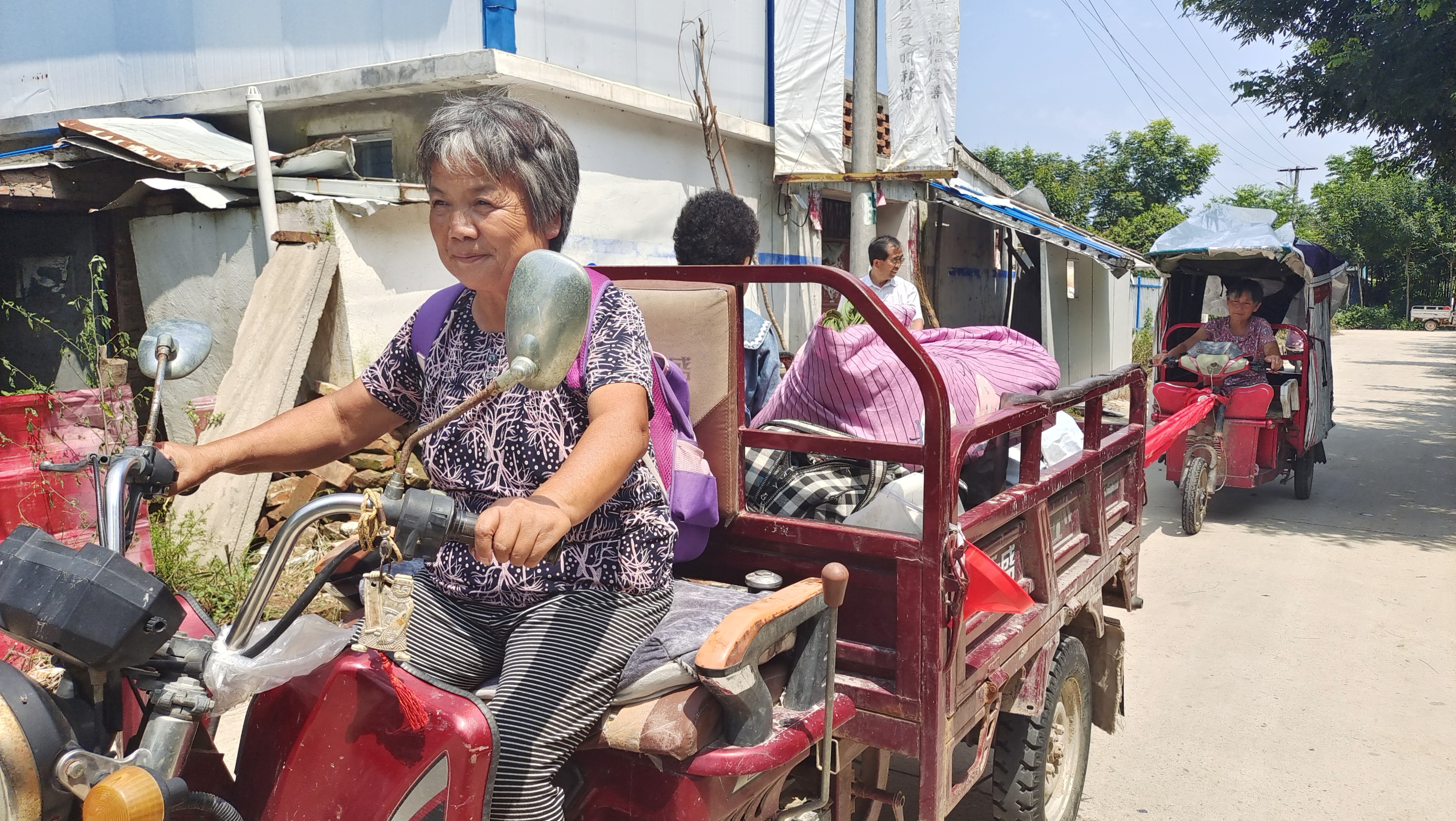 駛出不到幾百米,張梅碰到鄰居王妞的電動三輪車沒電了,這可讓王妞急出一把汗。她們一商量,就在車上找了一段舊條幅,由張梅的機動三輪車牽著王妞的電動三輪車?yán)^續(xù)趕路。