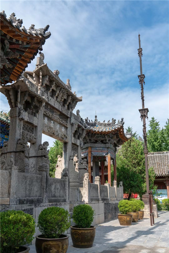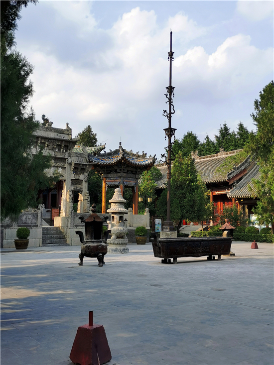 過山門,突現(xiàn)在眼前的是一對鐵旗桿。鐵旗桿高22米、重3萬余斤,且桿身鑄有銘文圖案、山水花卉、龍鳳鳥獸。