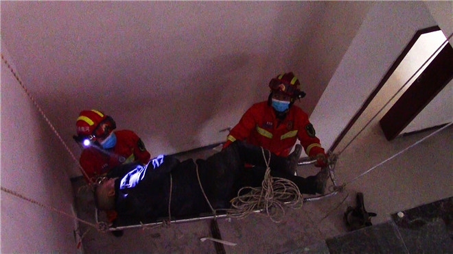 了解情況后,4名消防員立即深入地下室,利用擔(dān)架,先將老人保持原有姿勢轉(zhuǎn)移到擔(dān)架上,再用救援繩將老人綁在擔(dān)架上加以固定。最后,救援人員將擔(dān)架四角分別綁上救援繩,下方人員托扶擔(dān)架,上方人員將擔(dān)架平穩(wěn)的向上拉。經(jīng)過近30分鐘緊張救援,成功將被困老人救出,并交由醫(yī)護人員進(jìn)行下一步處理。②10