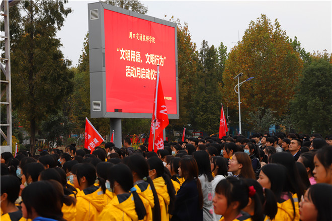 “我是周口交通技師學(xué)院的一名學(xué)生,從今天起,我要講禮儀、懂禮貌、不說臟話……積極參加“文明用語、文明行為”主題實(shí)踐活動(dòng),爭做文明學(xué)生。”10月26日,周口交通技師學(xué)院全體師生在學(xué)院“文明用語、文明行為”活動(dòng)月動(dòng)員會(huì)上集體宣誓。師生們堅(jiān)定的目光和錚錚的誓言,展現(xiàn)出青年學(xué)子講文明話、辦文明事、做文明人的堅(jiān)定決心。