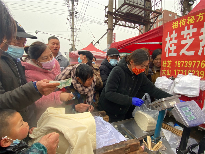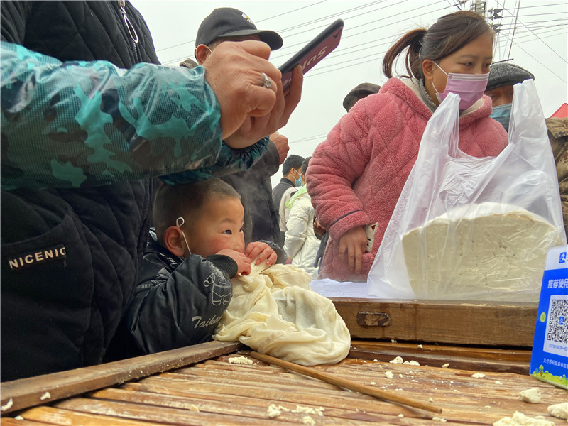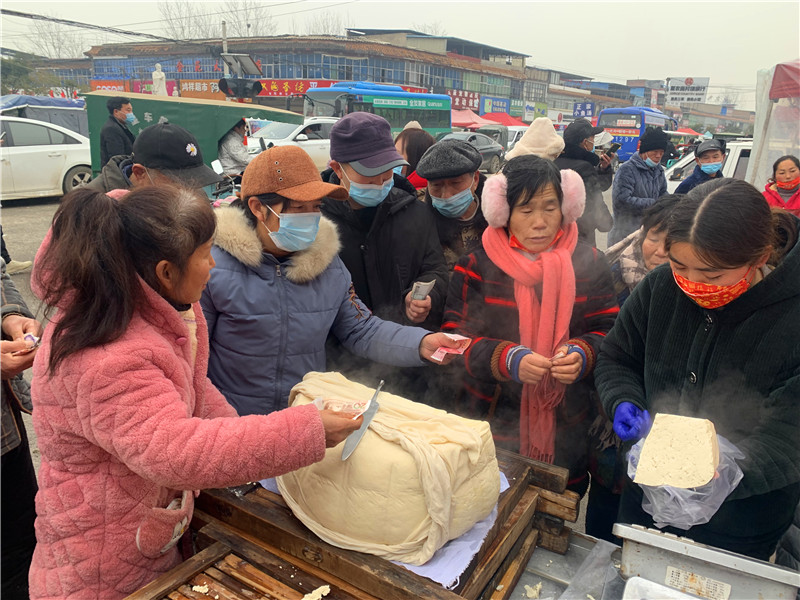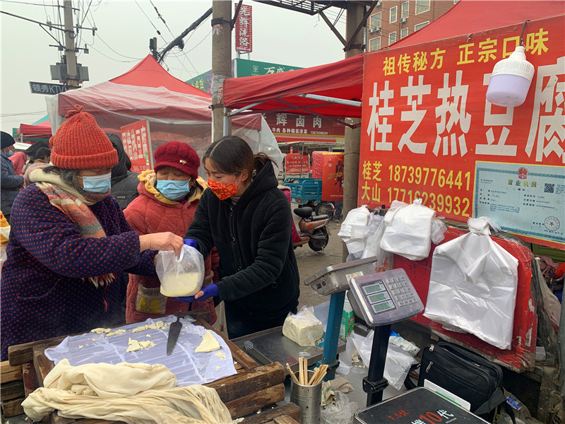 在固墻鎮(zhèn)的集市上,“桂枝熱豆腐”攤位前的顧客絡(luò)繹不絕。“給我來50塊錢的豆腐”“我要20斤,先給我切豆腐吧”“我要30斤,多少錢”……人群將豆腐攤里三層外三層圍了起來,從人群外朝里看看不見豆腐,只看到豆腐攤里冒出來的團(tuán)團(tuán)熱氣?!暗攘税雮€小時了,剛才那一盒豆腐沒輪到我就賣完了,這才搶到手?!备浇拇迕駰畲鬆斈弥鴦傎I的豆腐高興地說?!拔覐穆挂貋淼模憬阍诶锩鏀D著買豆腐,我在這兒等她呢?!?歲的張家瑞說,她每年放寒假都會和家人一起到固墻來探親,過年的時候逛逛集市,順便買些豆腐帶回鹿邑。