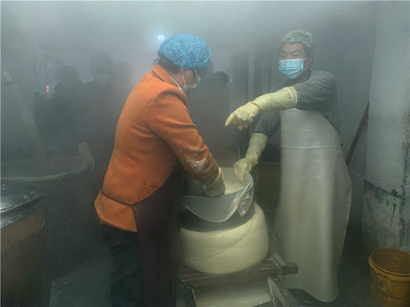 “旋乾磨上流瓊液,煮月鐺中滾雪花。”1月27日上午,聞著一股豆花香,記者走進(jìn)商水縣固墻鎮(zhèn)老朱家豆腐店,豆腐坊里工人們正忙得不可開交。工人將泡夠時間的豆子從水里瀝出來放進(jìn)磨豆機(jī)里,看著腫胖的黃豆在磨豆機(jī)的驅(qū)動下蹦蹦跳跳地等待著“變身”,聽著呼呼啦啦的機(jī)器聲,磨豆機(jī)的出漿口處暖黃色的漿液噴涌而出,不一會兒,等待接收漿液的桶被灌滿。在熬漿處,三口大鍋排排“坐”,爐火越燒越旺,鍋里乳白色的豆汁不停地翻騰?!盎鸷蚝苤匾?,熬不到勁兒不好吃,每一鍋都要大火熬制20分鐘左右?!崩现煺f,外面買豆腐的人越多,他們干得越起勁兒。起豆腐是最重要的一個環(huán)節(jié),需要很大的氣力和技巧,要二人通力協(xié)作完成,一人將點好的豆花舀進(jìn)一個用紗布縫制的“大網(wǎng)”里,另一人左右晃動“大網(wǎng)”將鹵汁排出,經(jīng)過循環(huán)往復(fù)操作,豆腐初見雛形。這還不算完,只見工人將“大網(wǎng)”周圍設(shè)置木筷子固定,把重百余斤的石頭放置上方壓著?!肮潭ㄐ螤?,再壓壓水,這樣做出來的豆腐緊實,口感好?!惫と丝祹煾嫡f。