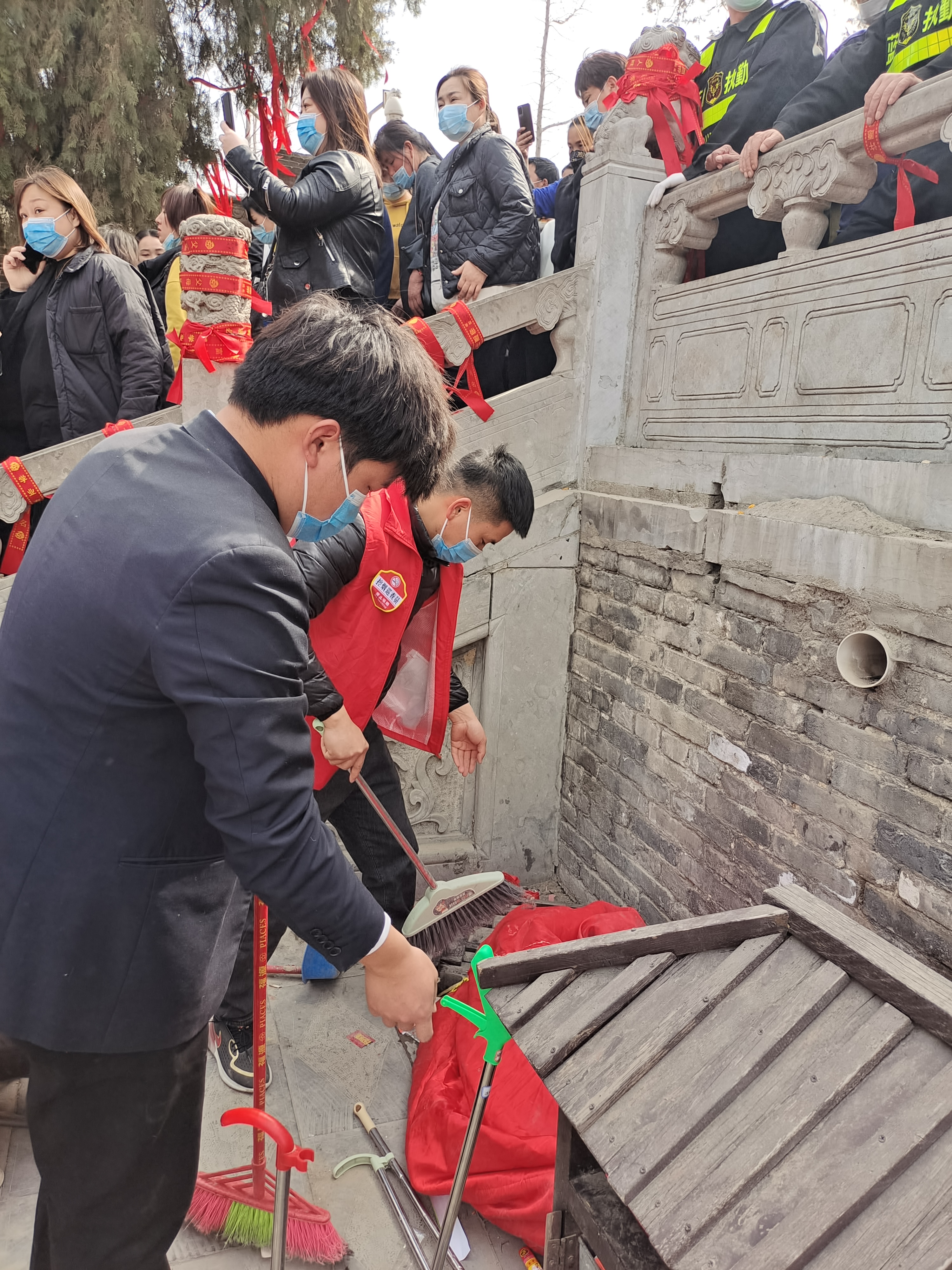 在伏羲陵墓后的蓍草園周圍,有人買紅布條系在欄桿上祈福,有人虔心祝禱。當(dāng)蓍草成為聚焦點(diǎn)時,有人卻拿著打掃工具默默清理垃圾,讓蓍草園成為一方“凈土”。見他們身穿紅馬甲,記者上前詢問,原來是來自建業(yè)物業(yè)的志愿者,其中一名叫李小宇,他說太昊陵已經(jīng)成為淮陽門面,要做好衛(wèi)生,把太昊陵的良好形象維持住?!拔覀兌际亲栽盖皝?,讓家鄉(xiāng)父老不論啥時候都看到一個干干凈凈的太昊陵!”李小宇說。