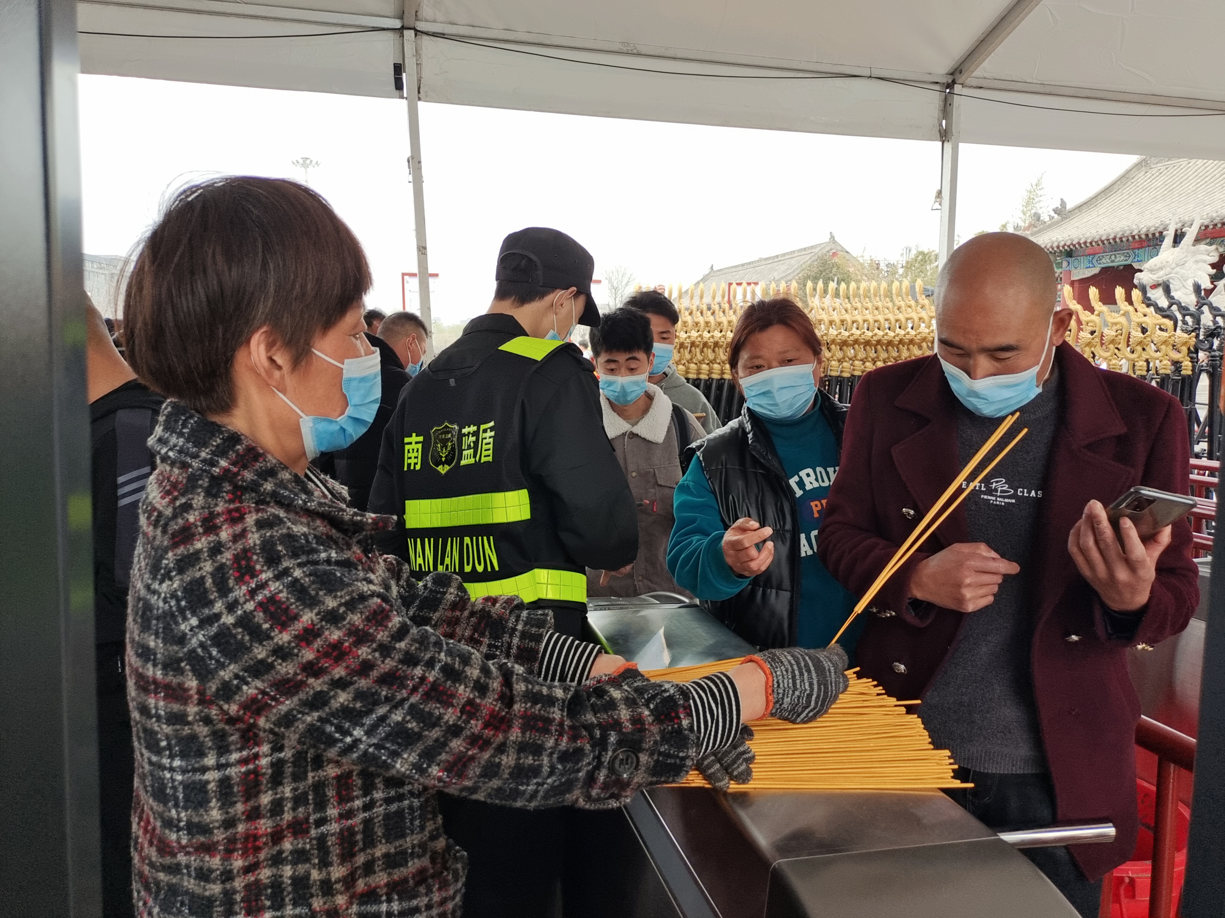 “這是您的祈福香,請拿好?!碧涣甑拿總€入口,既有專人檢查私自帶香行為,也有工作人員為游客免費(fèi)發(fā)放線香。家住淮陽區(qū)的李姐是其中一員,她早上5時30分就到達(dá)景區(qū),領(lǐng)取線香并整理,方便為游客發(fā)放?!爸灰€有游客來,我們就不休息,要把祈福的心愿送到他們手中,并引導(dǎo)他們文明燒香、文明祭祀。”李姐說。