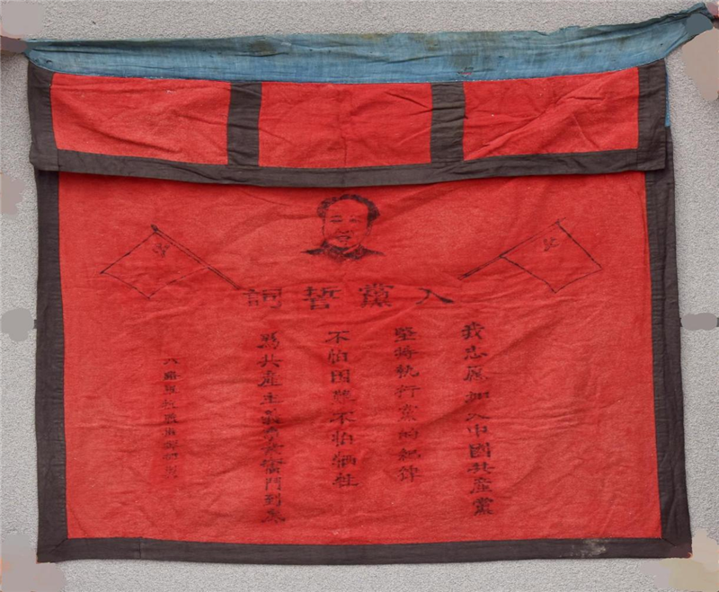 在德高民俗博物館,陳列著這樣一面旗幟,旗身長約90厘米,寬約70厘米,旗幟上印有毛澤東同志頭像及入黨誓詞文字,旗幟左下方印有“八路軍抗戰(zhàn)指揮部制”落款文字,該入黨誓詞旗幟為抗日戰(zhàn)爭時(shí)期制作完成。凝視這面旗幟,對(duì)革命先烈的欽佩感油然而生。