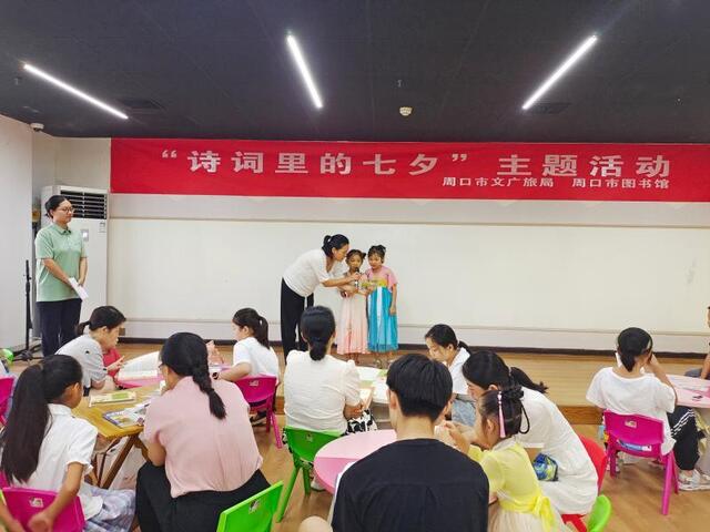 七夕今宵看碧霄,牽??椗珊訕?。8月20日,一場(chǎng)別開(kāi)生面的“詩(shī)詞里的七夕”主題活動(dòng)在周口市圖書(shū)館青少年活動(dòng)中心舉行。書(shū)香覓詩(shī)詞、同心題詩(shī)詞、粘土畫詩(shī)詞……參與的孩子在詩(shī)情畫意中感受到中華傳統(tǒng)節(jié)日的內(nèi)涵。