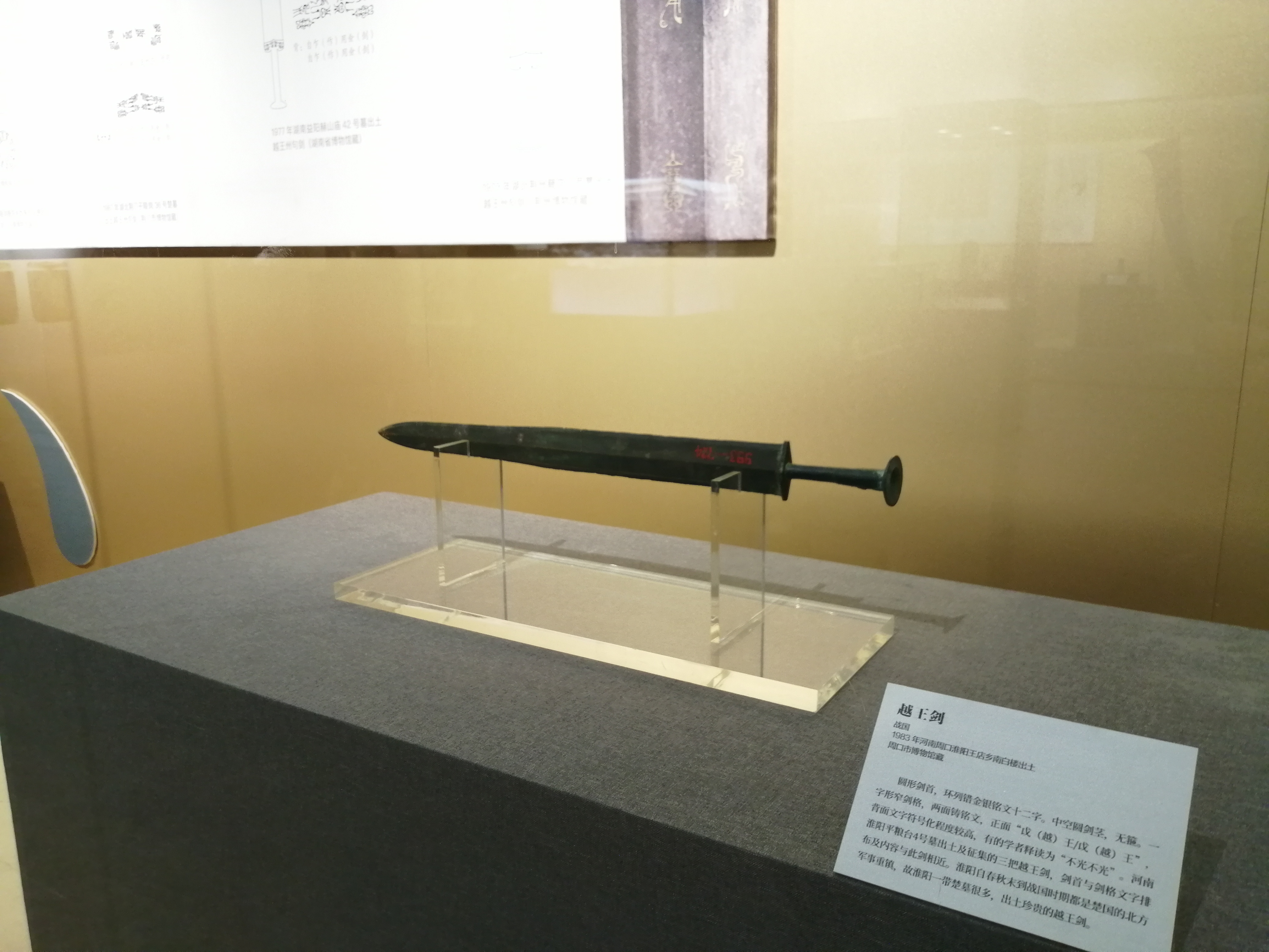 這把劍長59.9厘米,寬5.4厘米,劍格上用黃金鑲嵌有鳥篆體“越王越王”“不光不光”銘文,越王不光即越王勾踐的曾孫,也叫翳,其在位時國力衰弱。