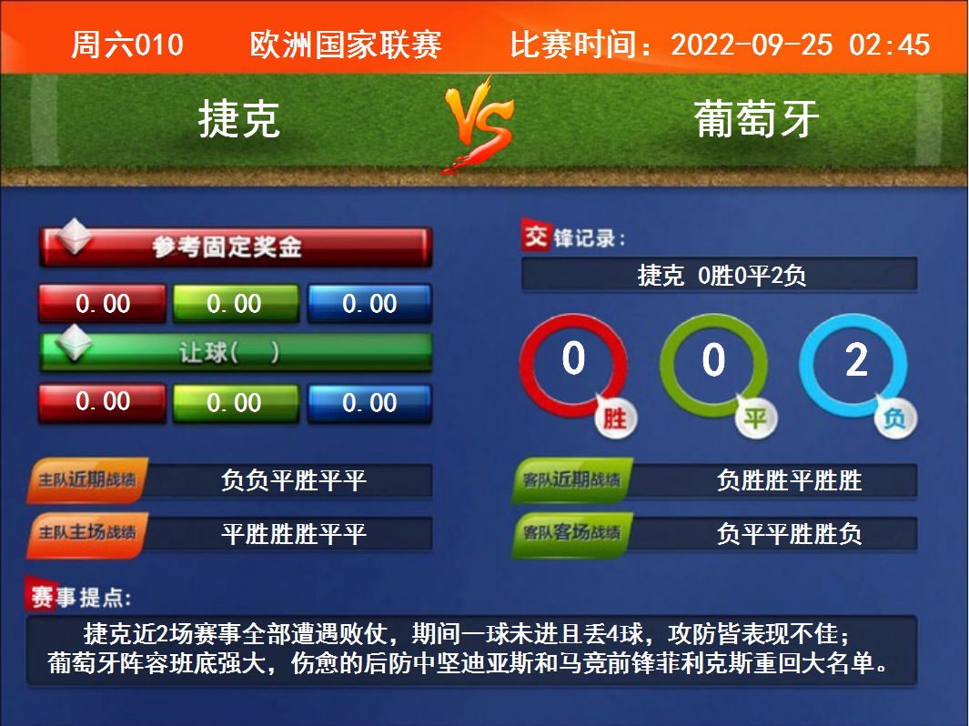 比賽時(shí)間:2022-09-25 02:45賽事提點(diǎn):捷克近2場賽事全部遭遇敗仗,期間一球未進(jìn)且丟4球,攻防皆表現(xiàn)不佳;葡萄牙陣容班底強(qiáng)大,傷愈的后防中堅(jiān)迪亞斯和馬競前鋒菲利克斯重回大名單。