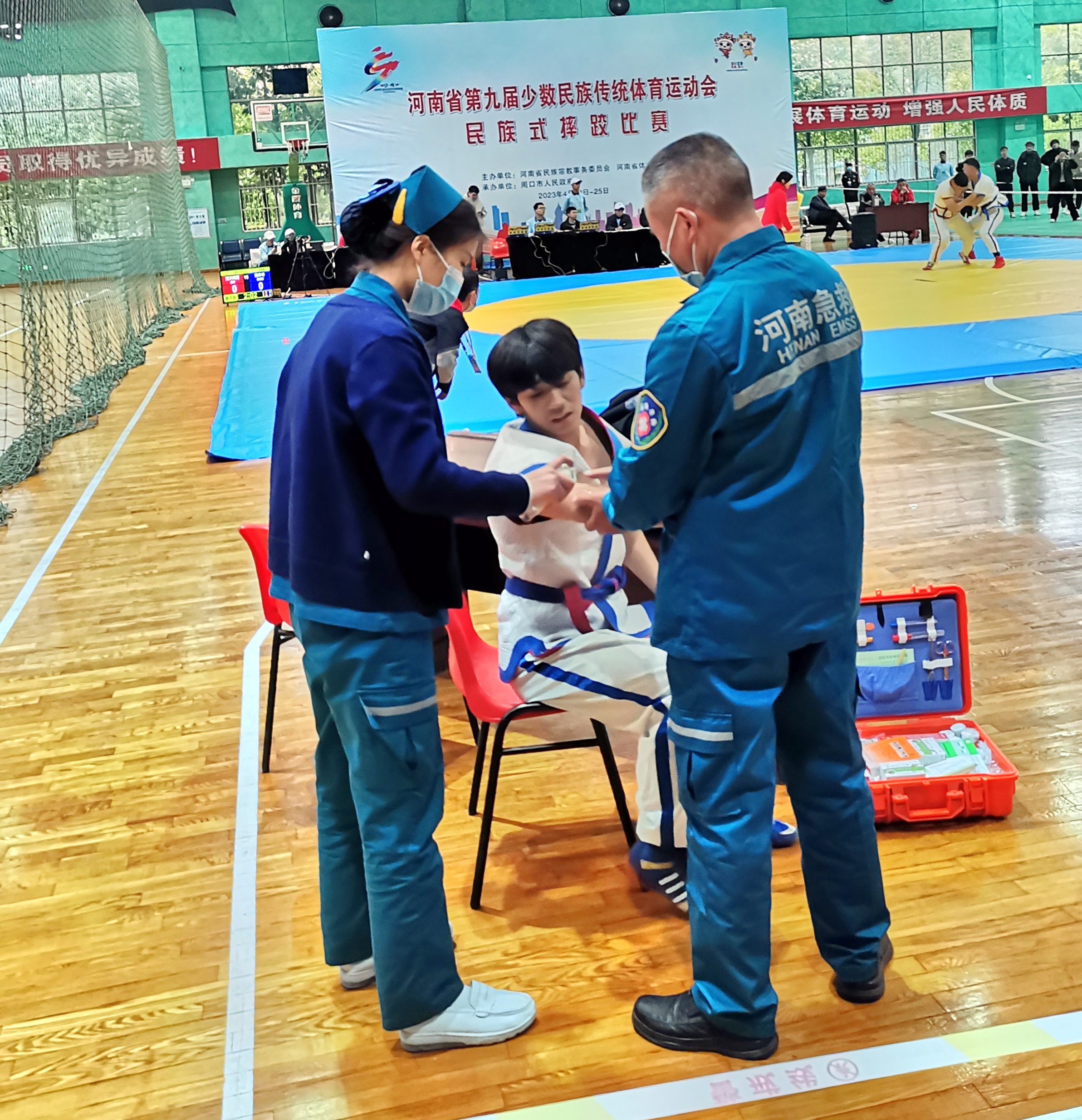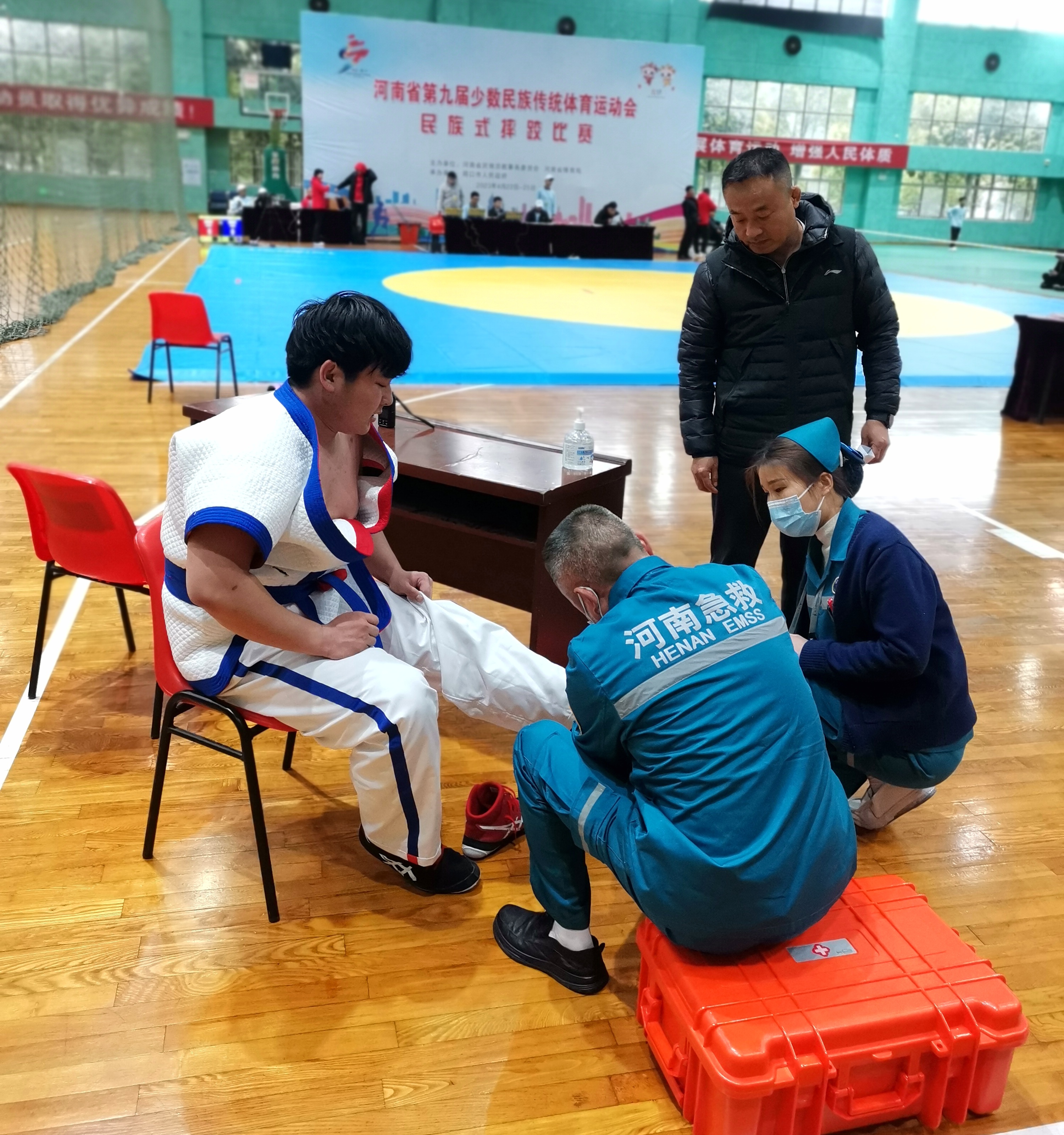 4月22日至26日,河南省第九屆少數(shù)民族傳統(tǒng)體育運動會在周口市舉辦。為確保來賓、運動員、教練員、技術(shù)官員等參會人員的醫(yī)療衛(wèi)生安全,周口市衛(wèi)生健康部門全面調(diào)動全市醫(yī)療資源,建立覆蓋各競賽項目及指定接待賓館的醫(yī)療救治、衛(wèi)生監(jiān)督、防疫消殺等醫(yī)療保健服務(wù)體系,認(rèn)真完善各項工作方案、預(yù)案,制定細化工作流程,為省運動會提供及時有效、熱情周到的醫(yī)療衛(wèi)生保障服務(wù)。圖為運動員在比賽中受傷,現(xiàn)場保障的醫(yī)護人員迅速處置。
