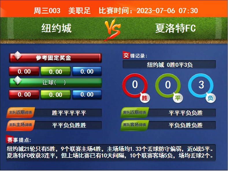 比賽時(shí)間:2023-07-06 07:30賽事提點(diǎn):紐約城21輪只有5勝,9個(gè)聯(lián)賽主場4勝,主場場均1.33個(gè)丟球防守偏弱,近6戰(zhàn)5平。夏洛特FC收獲3連平,但上場比賽已有10天間隔,10個(gè)聯(lián)賽客場5負(fù),場均丟球2個(gè)。