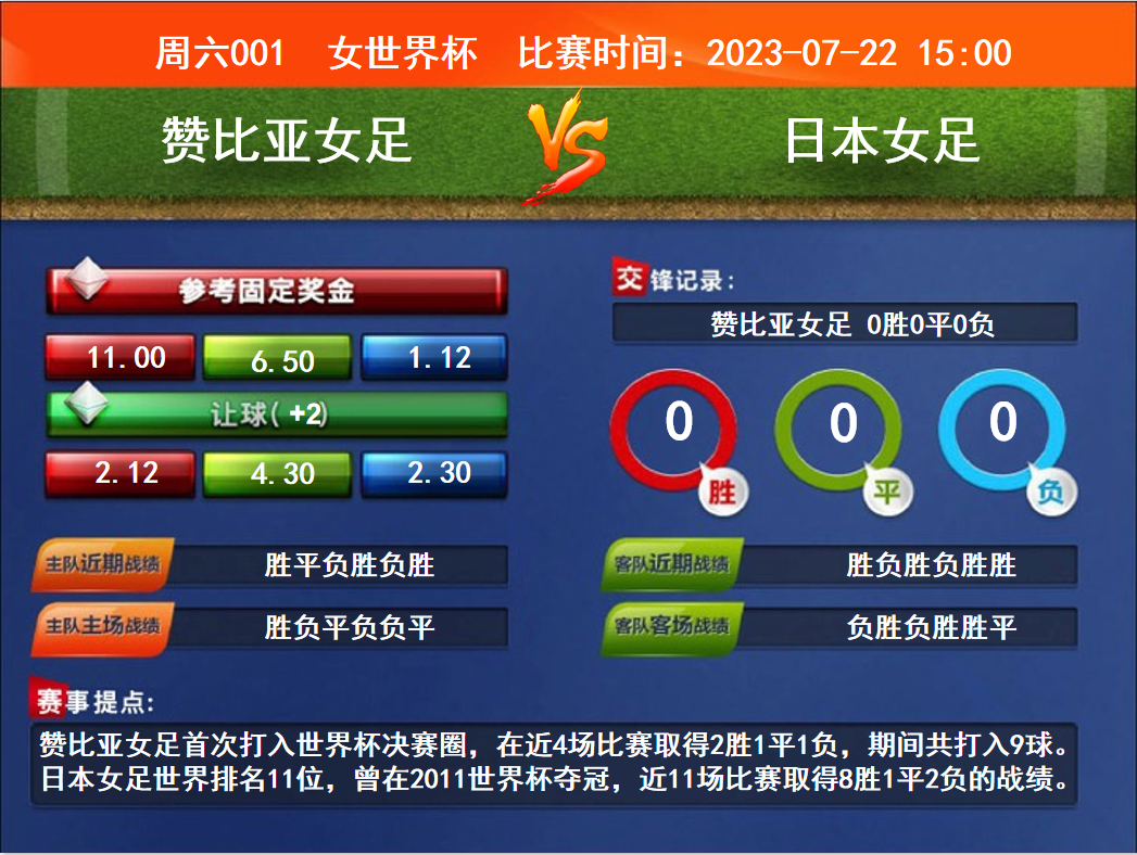 比賽時間:2023-07-22 15:00賽事提點:贊比亞女足首次打入世界杯決賽圈,在近4場比賽取得2勝1平1負(fù),期間共打入9球。日本女足世界排名11位,曾在2011世界杯奪冠,近11場比賽取得8勝1平2負(fù)的戰(zhàn)績。