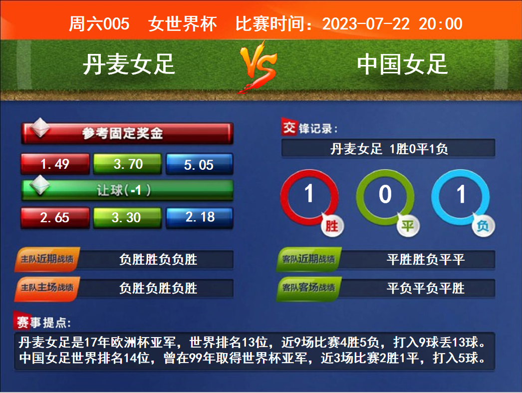 比賽時間:2023-07-22 20:00賽事提點:丹麥女足是17年歐洲杯亞軍,世界排名13位,近9場比賽4勝5負(fù),打入9球丟13球。中國女足世界排名14位,曾在99年取得世界杯亞軍,近3場比賽2勝1平,打入5球。