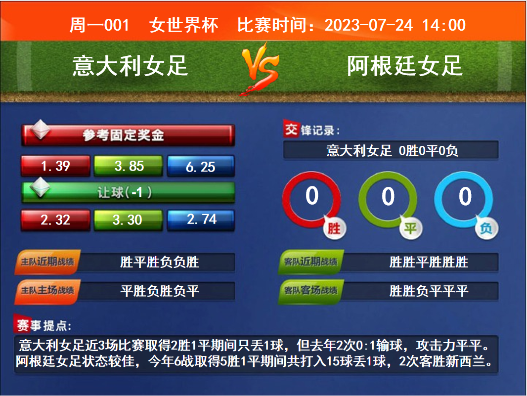 比賽時間:2023-07-24 14:00賽事提點:意大利女足近3場比賽取得2勝1平期間只丟1球,但去年2次0:1輸球,攻擊力平平。阿根廷女足狀態(tài)較佳,今年6戰(zhàn)取得5勝1平期間共打入15球丟1球,2次客勝新西蘭。