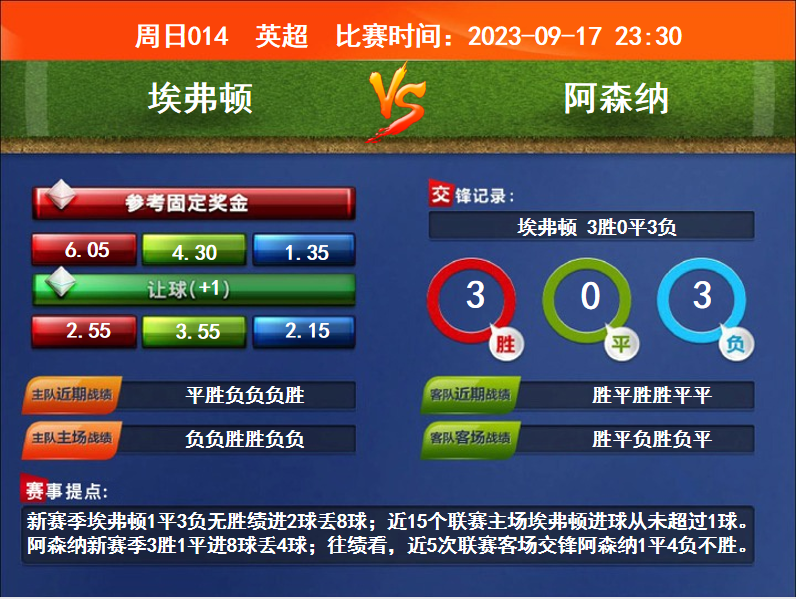 比賽時(shí)間:2023-09-17 23:30賽事提點(diǎn):新賽季埃弗頓1平3負(fù)無(wú)勝績(jī)進(jìn)2球丟8球;近15個(gè)聯(lián)賽主場(chǎng)埃弗頓進(jìn)球從未超過(guò)1球。阿森納新賽季3勝1平進(jìn)8球丟4球;往績(jī)看,近5次聯(lián)賽客場(chǎng)交鋒阿森納1平4負(fù)不勝。