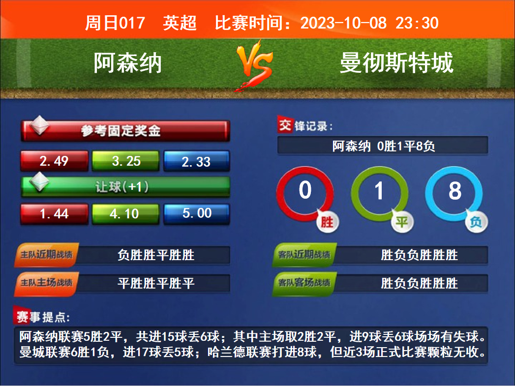 比賽時間:2023-10-08 23:30賽事提點:阿森納聯(lián)賽5勝2平,共進(jìn)15球丟6球;其中主場取2勝2平,進(jìn)9球丟6球場場有失球。曼城聯(lián)賽6勝1負(fù),進(jìn)17球丟5球;哈蘭德聯(lián)賽打進(jìn)8球,但近3場正式比賽顆粒無收。