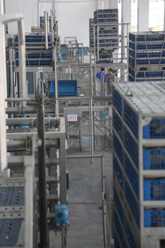 宰雞第一步先消毒,一筐筐自動(dòng)分好的白羽活雞上架后即得到?jīng)_洗,“干干凈凈”地進(jìn)入下一程序——掛雞。步驟與步驟銜接中的自動(dòng)化程度很高,掛雞室光線略暗?!拔覀儾捎脟H化標(biāo)準(zhǔn),宰殺環(huán)節(jié)在暗室進(jìn)行?!毕嚓P(guān)人員說。