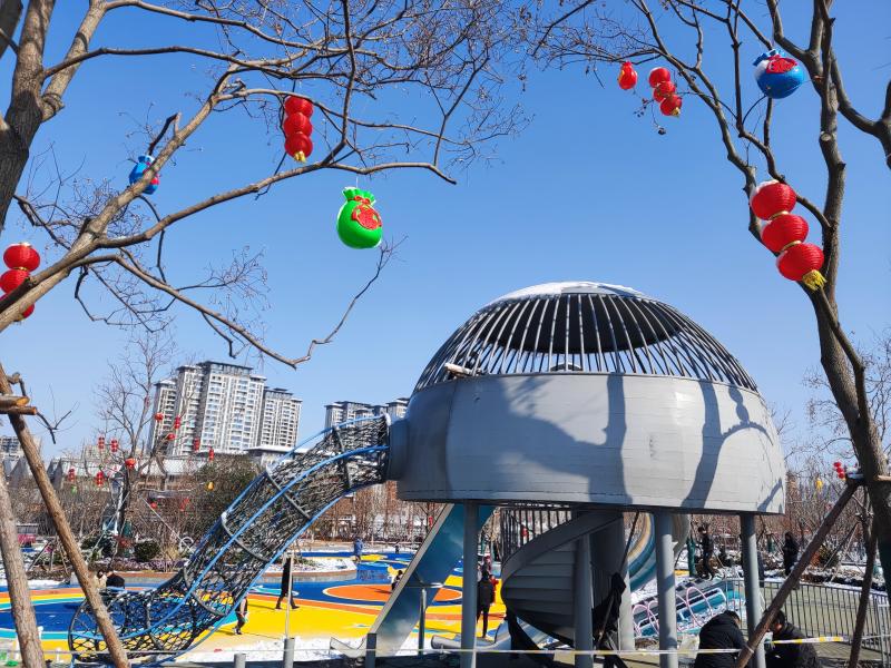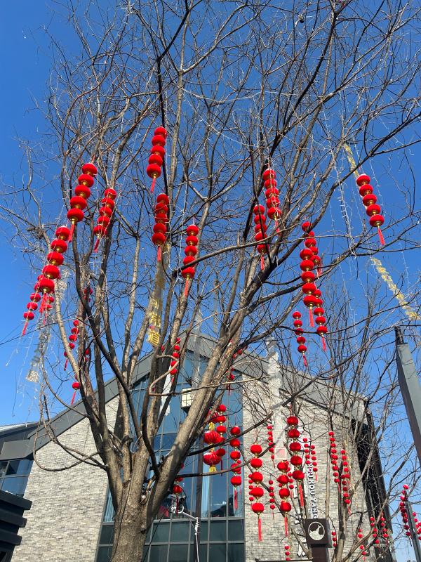 1月23日,記者在施工現場看到,施工人員正緊鑼密鼓進行最后的掃尾工作。道路兩旁樹枝上掛滿了象征吉祥如意的紅燈籠、中國結、春字燈飾。