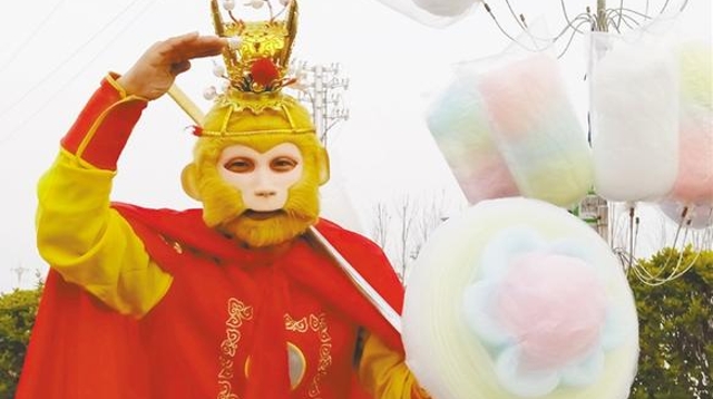 “媽媽快看,美猴王!”2月14日,在商水文化廣場,一名身著美猴王服飾的棉花糖攤主引得市民駐足觀看。記者也隨著人群來到了這個(gè)小攤前。聽聲音,記者感覺攤主年齡不大。走近一看,只見“美猴王”從一個(gè)個(gè)小盒子將各種顏色的白糖,舀進(jìn)棉花糖機(jī)里,隨后緩緩地轉(zhuǎn)動(dòng)長竹簽,不一會(huì)兒,一絲絲彩色的糖霜就纏繞在長竹簽上,經(jīng)過“美猴王”的巧手制作,一朵彩色的棉花糖“花”不一會(huì)兒就做好了。