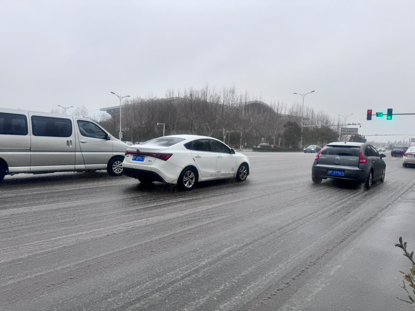 記者在周口大道看到,過往車輛紛紛拉開車距、緩慢通行,騎電動(dòng)車的市民大多戴上了帽子、裹緊了身上的棉衣,過往行人撐著雨傘、頂著寒風(fēng)匆匆趕路。