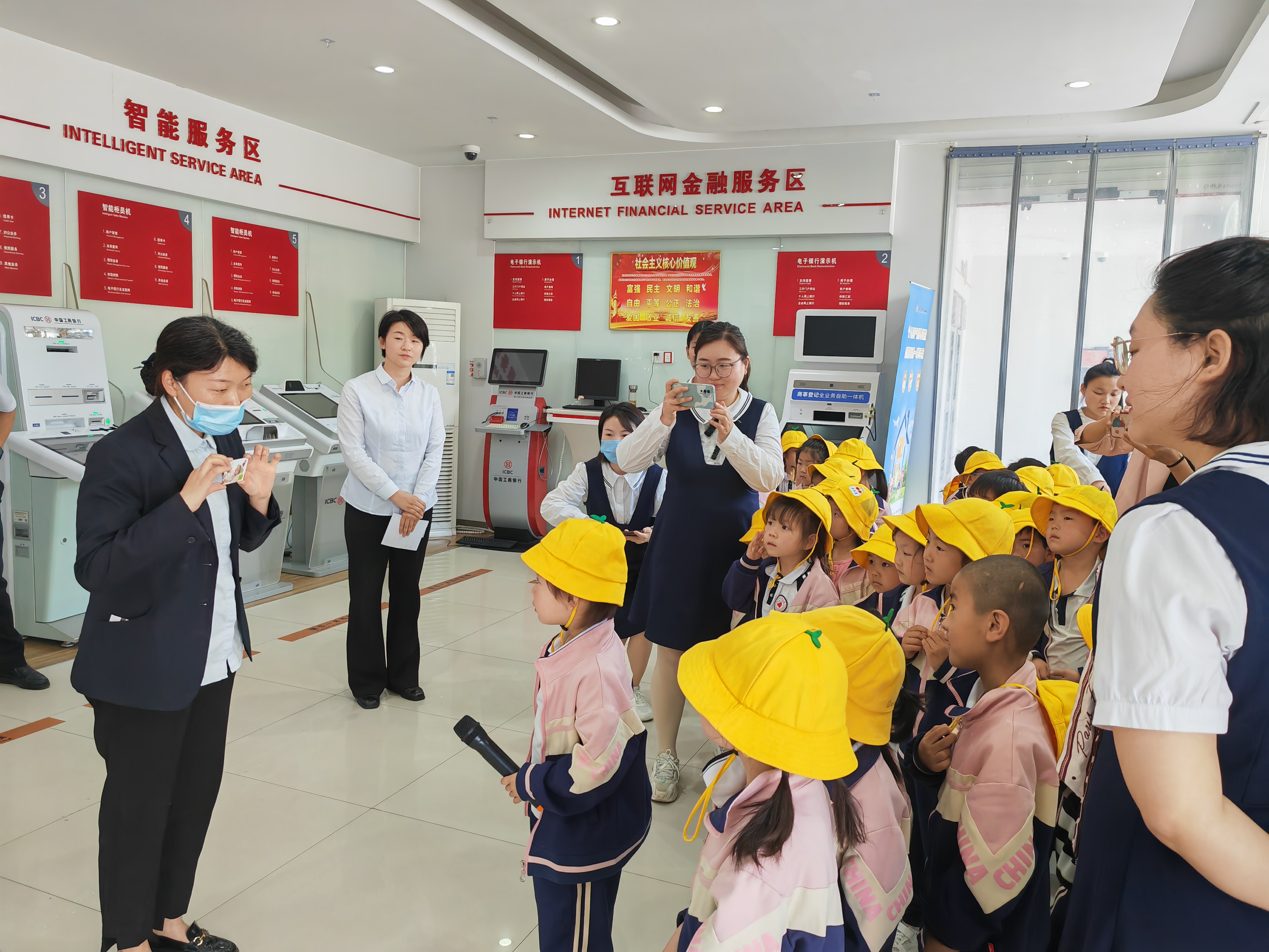 小朋友們在參觀營業(yè)網(wǎng)點(diǎn)中,該行工作人員為孩子們講解取號機(jī)、業(yè)務(wù)咨詢臺、服務(wù)窗口、自動存取款機(jī)功能,簡要介紹辦理銀行業(yè)務(wù)流程,并對孩子們提出的問題一一解答。
