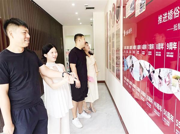 近年來,沈丘縣加大精神文明建設(shè)力度,通過舉辦文化大講堂等活動,在廣大群眾中形成“天價彩禮不可取,鋪張浪費(fèi)最可恥,陳規(guī)陋習(xí)危害大”的共識,許多年輕人在耳濡目染中受到熏陶,新事新辦蔚然成風(fēng)。圖為8月29日,農(nóng)歷七月初七,結(jié)婚登記的新人在婚史展板前駐足。