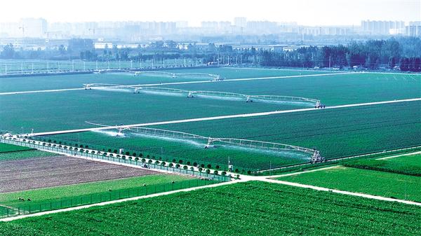 ?7月18日,在扶溝縣城郊鄉(xiāng)高標準農田里,大型移動灌溉設備正在為農作物澆水。