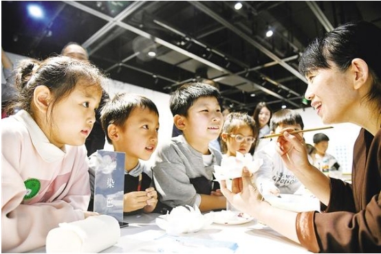 ?9月27日,孩子們圍著制作荷花瓷的阿姨,觀看如何著色。當(dāng)日,由周口市文廣旅局、周口市文聯(lián)主辦的“荷韻清風(fēng)”周口荷花瓷藝術(shù)展在周口美術(shù)館開展。