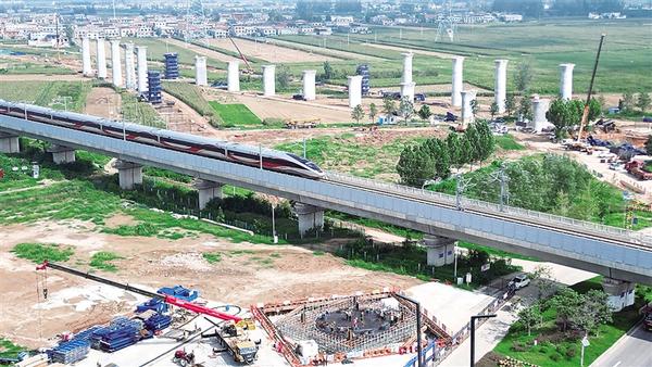 9月16日上午,建設(shè)中的項(xiàng)城通濟(jì)大道橋臥波于沙潁河之上,貨船從30米寬的通航孔緩緩馳過,保障豫貨出海。