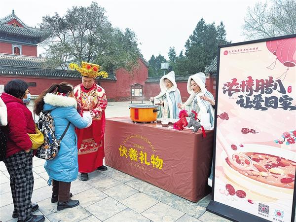 1月26日,游客排隊(duì)領(lǐng)取臘八粥。當(dāng)日,農(nóng)歷臘月初八,一場以“財(cái)神賜福·才女奉粥·共迎祥瑞”為主題的活動(dòng)在太昊陵景區(qū)太極門廣場精彩上演,為游客們帶來了一場沉浸式文化盛宴。