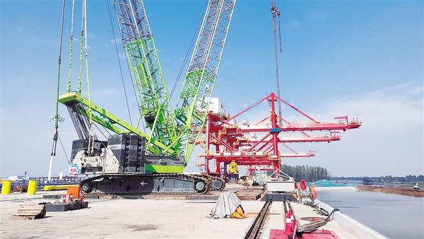 秋雨初霽,10月22日的周口港小集作業(yè)區(qū)碼頭顯得格外敞亮。堆場6臺高高的場橋(集裝箱龍門起重機)如塔聳立,一灣碧水映襯著碼頭上的4臺橘紅色岸橋(岸邊集裝箱起重機),大港氣勢令人仰視。