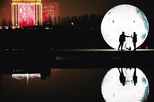 1月18日晚,兩名青年站在引黃調(diào)蓄湖邊的“月亮”前開心地唱歌,表達(dá)對(duì)新年的期盼之情。