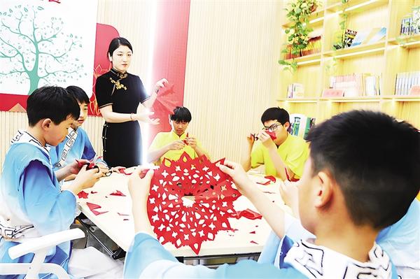 “五一”假期,周口市非物質(zhì)文化遺產(chǎn)剪紙項(xiàng)目代表性傳承人劉秀華(左三)在淮陽伏羲公園的石榴學(xué)堂內(nèi),為學(xué)生講授剪紙知識(shí),既提高了學(xué)生的剪紙水平及欣賞能力,又豐富了他們的假日文化生活。