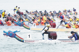 6月14日,選手們在比賽中。6月13日,馬來西亞沙巴州首府哥打基納巴盧舉行第二屆沙華堂國際龍舟賽,迎接即將到來的中華民族傳統(tǒng)節(jié)日——端午節(jié)。