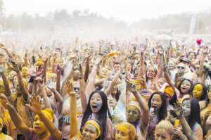 6月13日,在美國洛杉磯,跑步愛好者在“彩色跑”活動中。當日,約萬名跑步愛好者在洛杉磯道奇球場外參加“彩色跑”活動。新華社發(fā)
