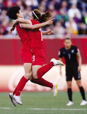 6月15日,中國隊(duì)球員王珊珊(左)慶祝進(jìn)球。