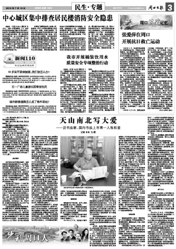 當(dāng)記者在北京見到張柱堂時(shí),他的容貌和記者的想象差別不大。從外表看,他就是位普通而慈祥的老人,見了誰都笑呵呵的,即便在新疆生活了50年,張口還是地道流利的家鄉(xiāng)話。見到家鄉(xiāng)人,張柱堂激動(dòng)的心情溢于言表,他拿出自己做的《周口日?qǐng)?bào)》剪貼本讓我們翻閱,談起家鄉(xiāng)近年來取得的可喜變化,他都能一件一件清晰準(zhǔn)確地道來。此刻我方知,在老人平靜的外表下,蘊(yùn)藏著的是怎樣熾熱的家鄉(xiāng)情。