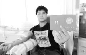 6月14日,一名參加無償獻血的河北保定市民在展示他的無償獻血證。當日是世界獻血者日,全國多地開展主題活動,向市民普及無償獻血的意義,并號召市民無償獻血、奉獻愛心。新華社記者 朱旭東 攝